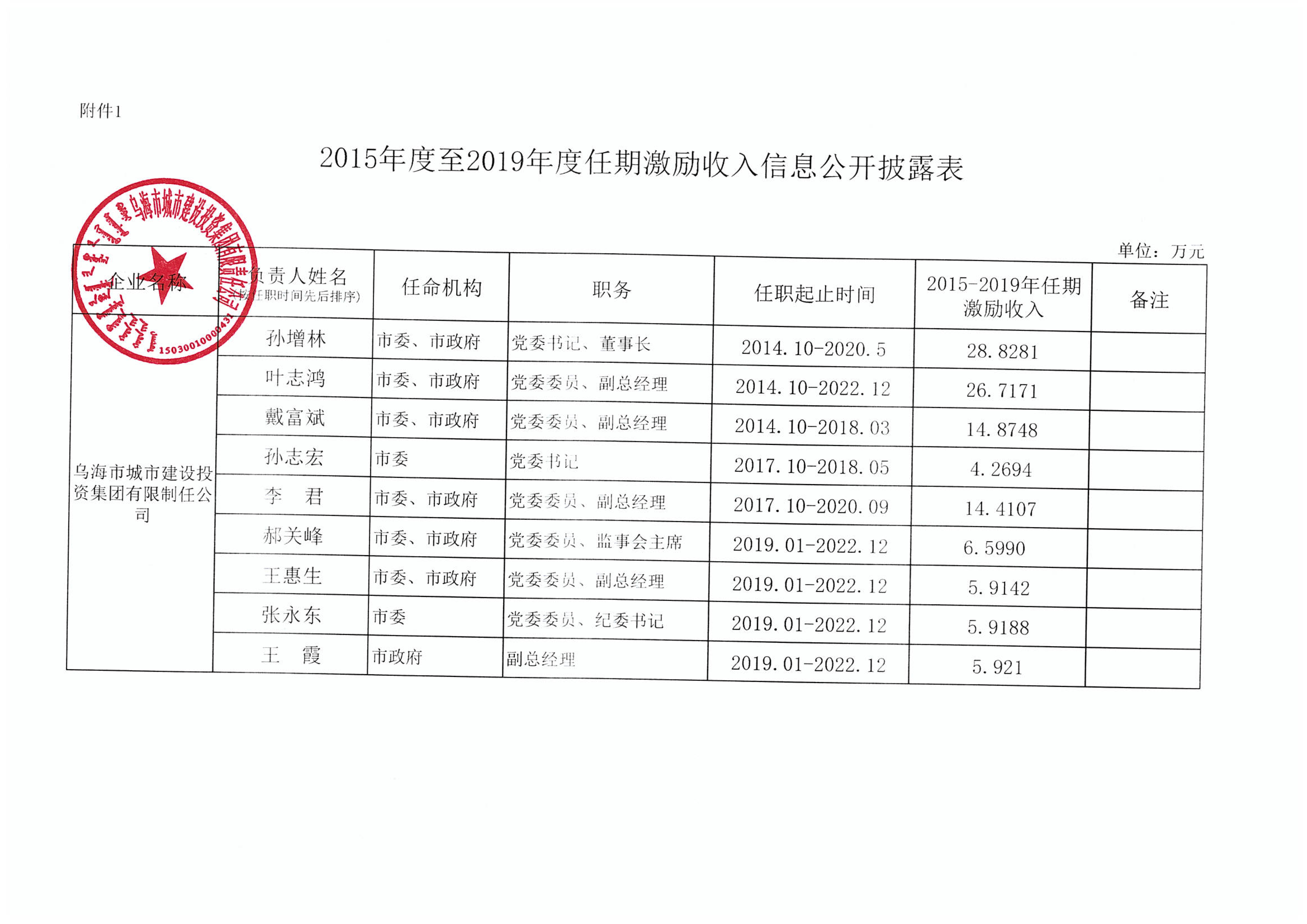烏海市城市建設(shè)投資集團(tuán)有限責(zé)任公司2015年度至2019年度任期激勵收入信息公開披露表