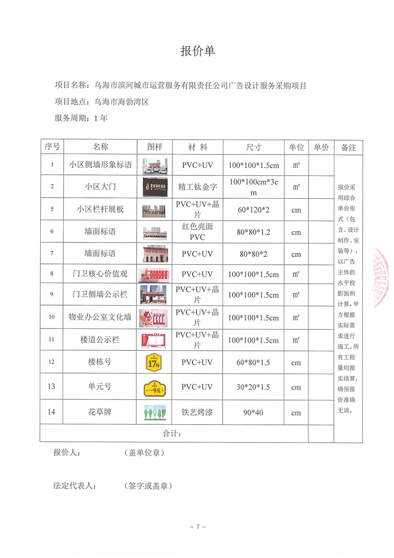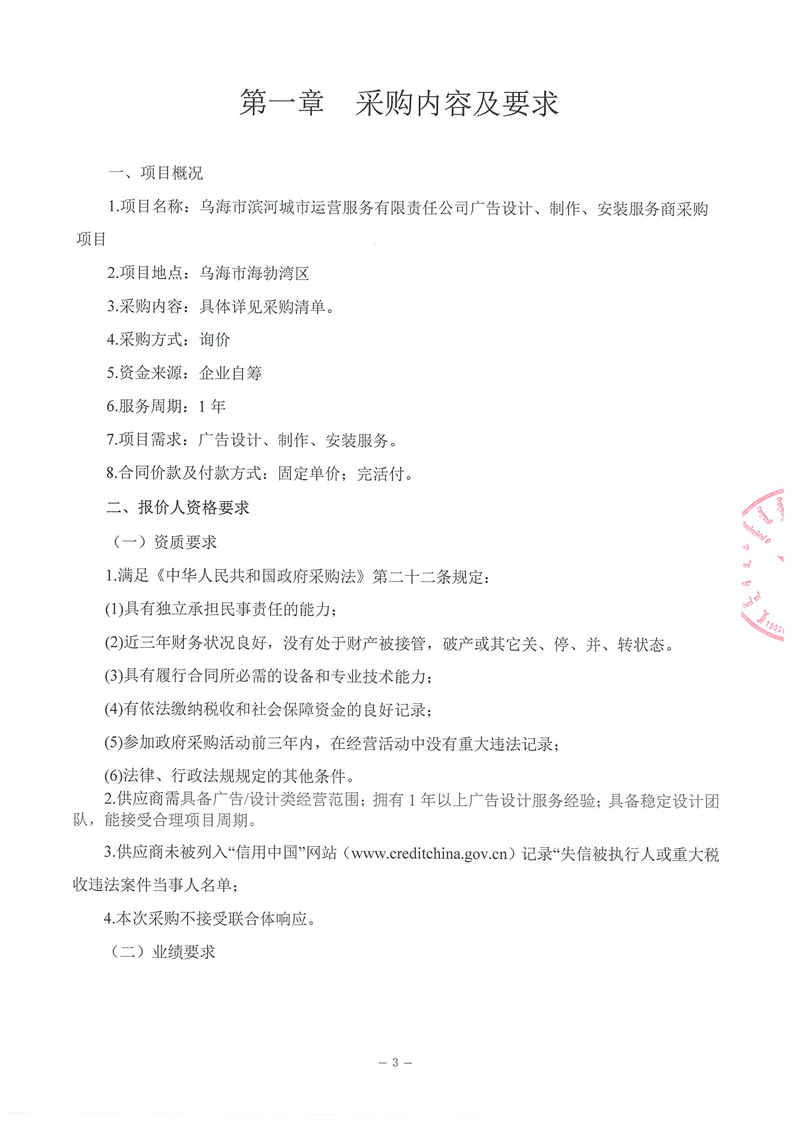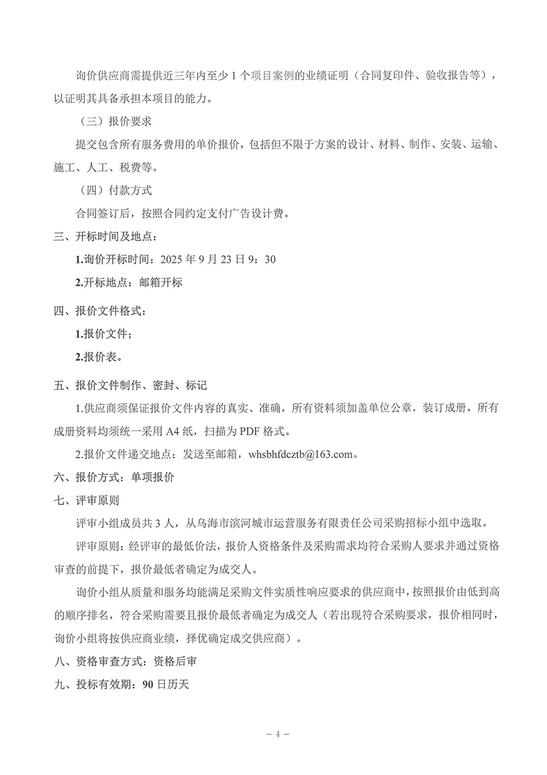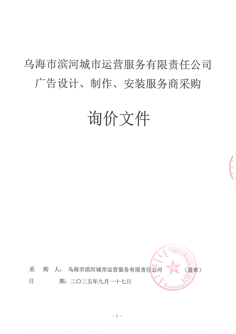 烏海市濱河城市運(yùn)營服務(wù)有限責(zé)任公司廣告設(shè)計(jì)、制作、安裝服務(wù)商采購詢價(jià)文件