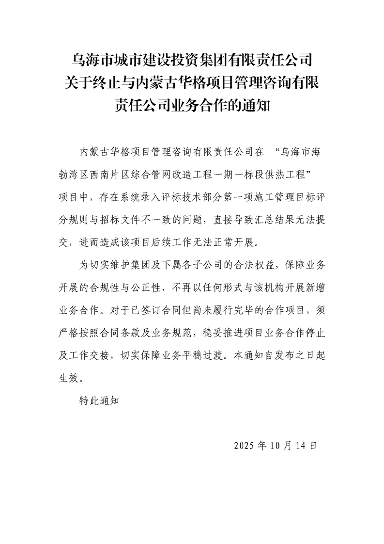 烏海市城市建設投資集團有限責任公司關于終止與內(nèi)蒙古華格項目管理咨詢有限責任公司業(yè)務合作的通知