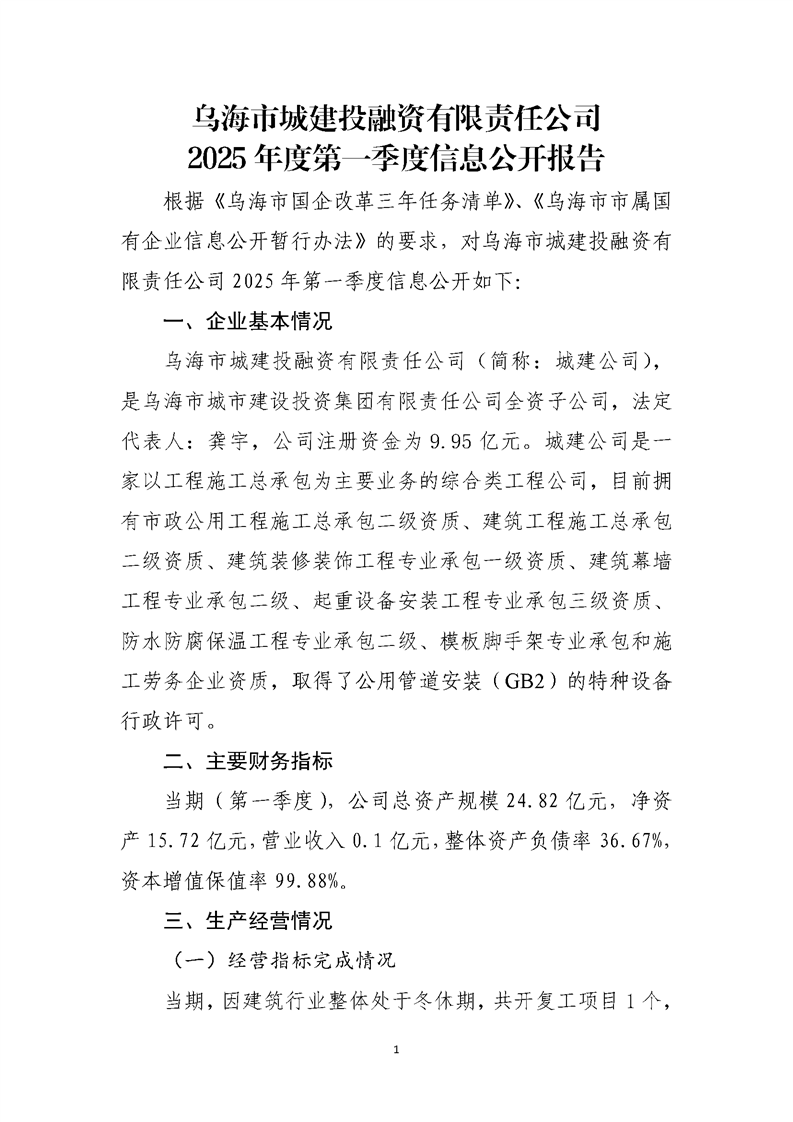 - 2025-07-28烏海市城建投融資有限責(zé)任公司2025年度第二季度信息公開