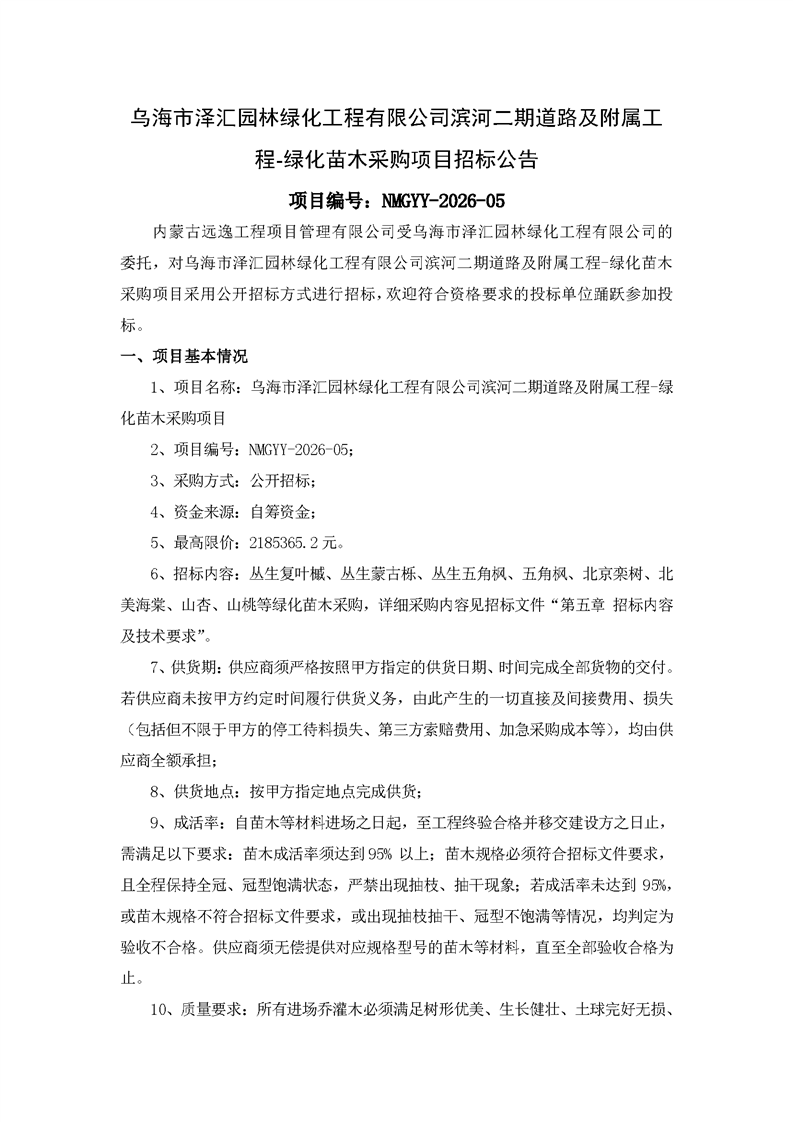 - 2026-03-112026年烏海市澤匯園林綠化工程有限公司管材采購項目比選采購公告