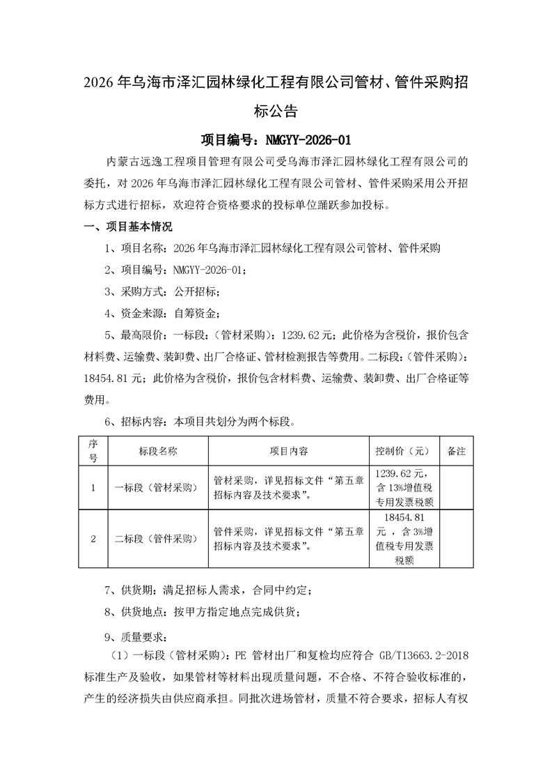 - 2026-03-112026年烏海市澤匯園林綠化工程有限公司管材采購項(xiàng)目比選采購公告