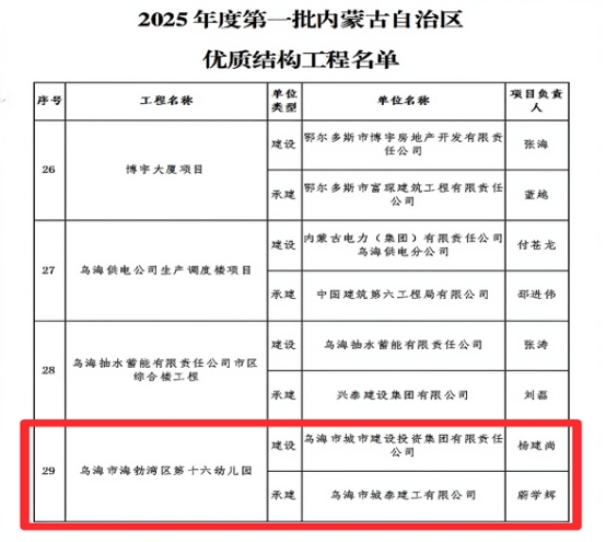 烏海市海勃灣區(qū)第十六幼兒園項(xiàng)目榮獲2025年度第一批內(nèi)蒙古自治區(qū)優(yōu)質(zhì)結(jié)構(gòu)工程